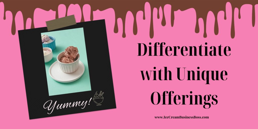 Making a signature flavor that becomes associated with your brand is a potent strategy for achieving this differentiation. This flavor should capture the unique characteristics of your community or represent a unique fusion of flavors. If your ice cream shop is located close to a plentiful strawberry farm, creating a “Farm-Fresh Strawberry Swirl” flavor could be a huge growth.